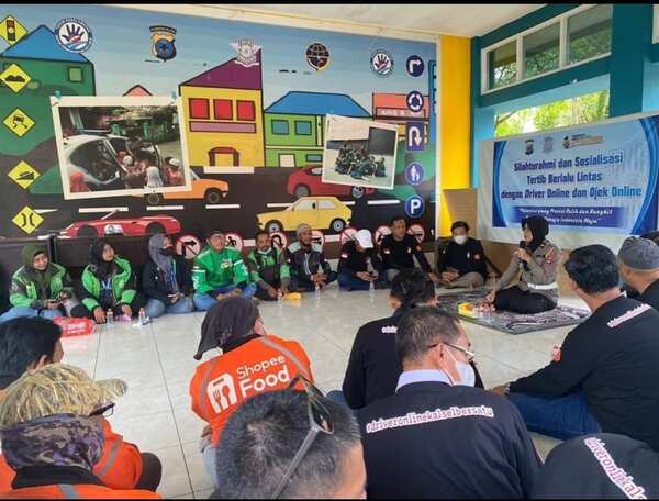Lebih kurang 50 pengendara mitra Ojol diajak berdiskusi dalam sosialisasi yang dibuka langsung Direktur Lalu Lintas Polda Kalsel, Kombes Pol Maesa Soegriwo
