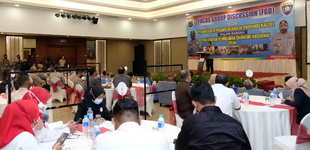 Polda Kalsel, Banjarmasin – Polda Kalsel menggelar Focus Group Discussion (FGD) bertemakan “Peran Serta Pelaku Usaha Di Propinsi Kalsel Dalam Percepatan Pemulihan Ekonomi Nasional”. Berlangsung di Hotel Rattan Inn Banjarmasin kegiatan tersebut dibuka langsung oleh Kapolda Kalsel Irjen Pol Drs. Rikwanto, S.H., M.Hum., Senin (1/3/2021) pukul 08.30 Wita.