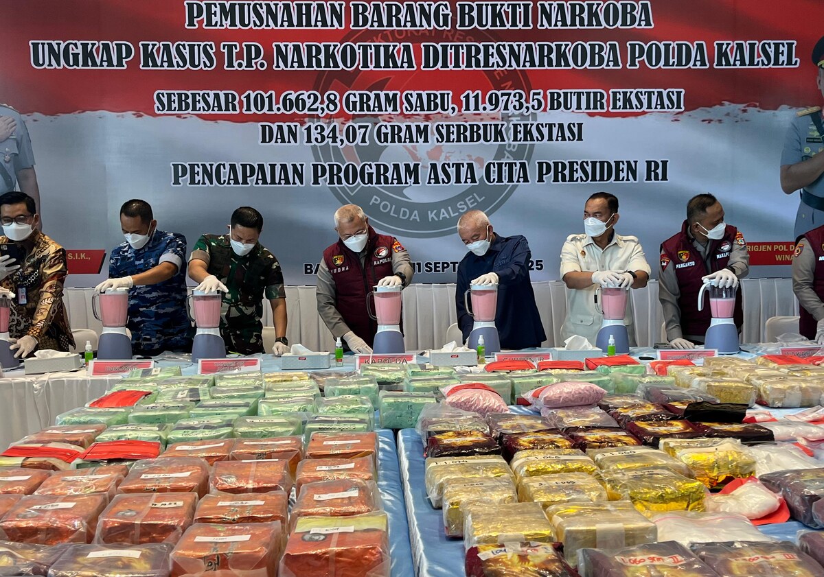 Banjarbaru, BARITOPOST.CO.ID – Sebanyak 101,6 kilogram sabu, 11.973 butir pil ekstasi, dan 134 gram serbuk ekstasi dimusnahkan Polda Kalimantan Selatan, Kamis (11/9/2025). Pemusnahan barang haram tersebut disaksikan langsung oleh 60 tersangka kasus narkotika yang terdiri dari 59 laki-laki dan 1 perempuan, hasil pengungkapan 45 laporan polisi.