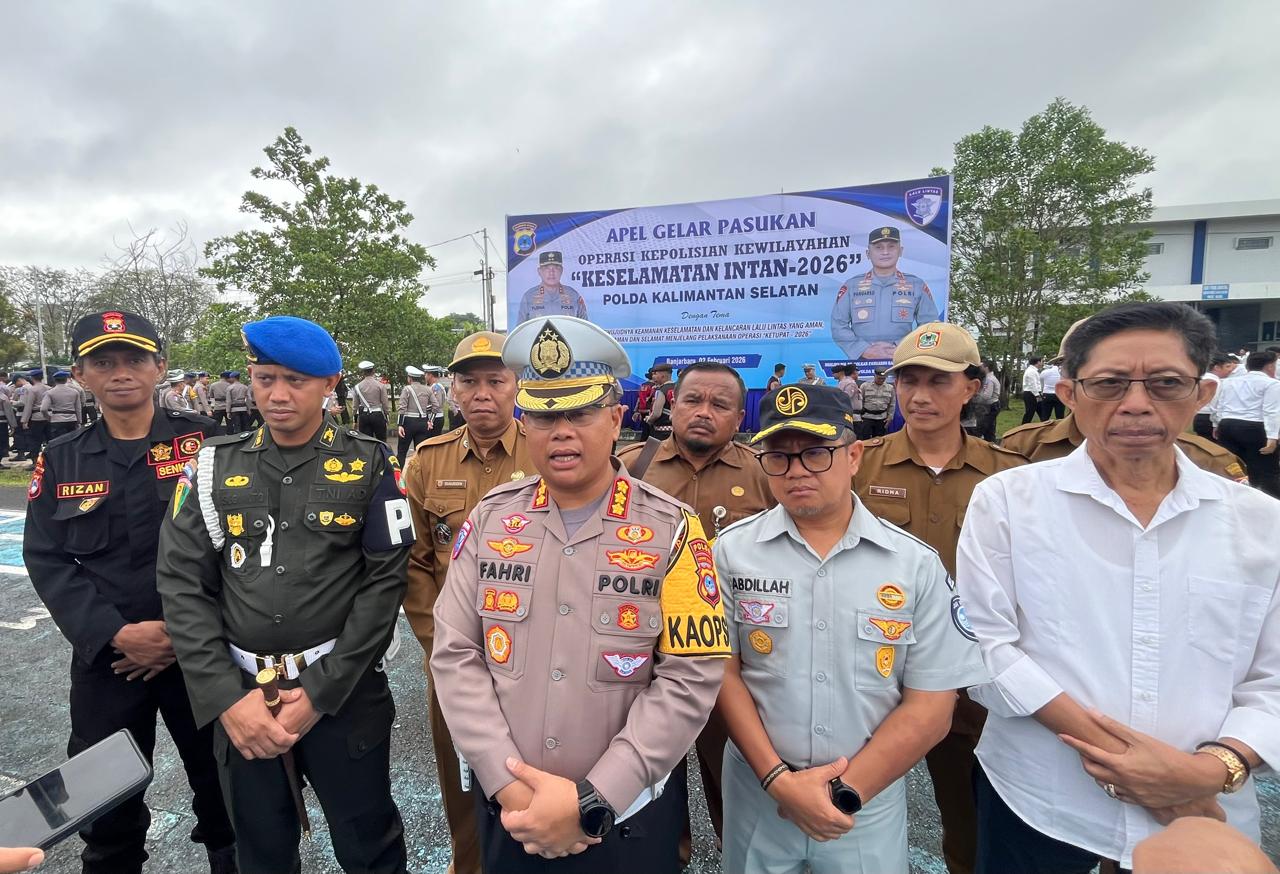 OPERASI KESELAMATAN INTAN – Dirlantas Polda Kalsel Kombes Pol Dr M Fahri Siregar didampingi unsur TNI, Dishub dan Jasa Raharja saat memberikan keterangan pers usai apel gelar pasukan Operasi Keselamatan Intan 2026 di Banjarbaru, Senin (2/2/2026). (foto: istimewa)