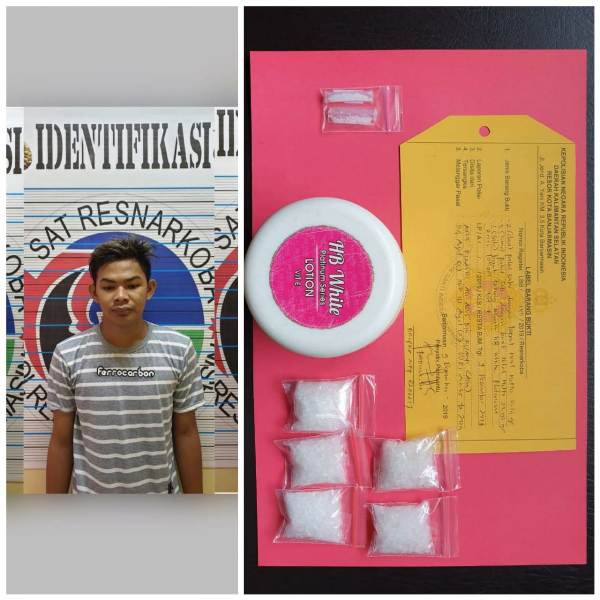 Kasat Narkoba Polresta Banjarmasin Kompol H Wahyu Hidayat, Kamis (12/12/2019) sore mengatakan, saat itu pelaku menyerahkan kepada petugas yang menyamar sebagai pembeli Sabu. Setelah penggeledahan di dalam rumahnya ditemukan barang bukti berupa lima paket tersebut di dalam wadah bundar HB White Lotion warga merah muda.