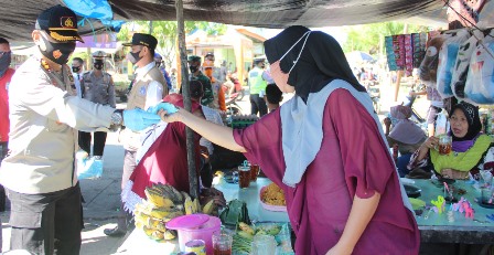 Kapolres Batola Bersama Wakil Bupati Batola dan Dandim 1005 Marabahan menggelar serentak memberikan Masker gratis kepada masyarakat yang melintas di simpang 4 Jln Nasution dan Pasar Marabahan untuk memutus mata rantai pandemi Covid-19 yang diawali dengan Sosialisasi dan dilaksanakan nya pembagian Masker gratis dan diberlakukan sanksi apabila ditemukan warganya yang masih membandel, Rabu (19/8/2020).