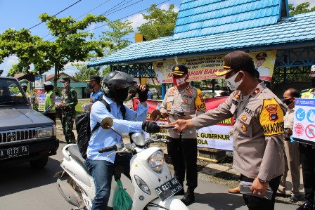 Kapolres Batola AKBP Lalu Moh Syahir Arif, S.I.K., S.H.,M.M., bersama Wakil Bupati Batola H Rahmadianoor ST serta Dandim 1005 yang diwakili Kasdim 1005 Marabahan Mayor Infantri Priyo Budi Suswanto, Waka Polres Batola Kompol Jatmika SH MH, para PJU Polres Batola dan Polsek Jajaran  langsung melakukan kegiatan bagi masker di pinggir jalan serta sekaligus sosialisasi Perbub Batola nomor 54 tahun 2020.