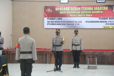 Polres Batola, Jum’at 16/10/2020, Kapolres Batola AKBP Lalu Moh Syahir Arif, S.I.K.,M.M pimpin sertijab mengatakan, untuk jabatan Kasat Reskrim Polres Batola yang lama AKP Debi Triyani M. S.H., S.I.K pindah tugas ke Polres Tanjung Polda Kalsel. Sedangkan Kasat Reskrim yang baru IPTU Fransiskus Manaan , STK., S.I.K, sebelumnya menjabat di Krimum Polda Kalsel, Sabtu (17/10/2020).
