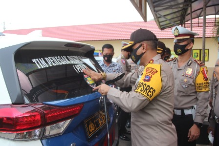 Polres Batola dalam rangka untuk meningkatkan kesadaran masyarakat mematuhi protokol kesehatan terutama dalam hal kepatuhan menggunakan masker, Batola pasang Stiker “Ayo Pakai Masker”, “Batola Bermasker”, dan “3M + 1T” di Kendaraan Dinas Kepolisian juga kendaraan Bhabinkamtibmas, Rabu (30/9/2020).