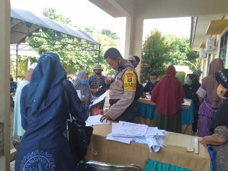 Bhabinkamtibmas Aiptu Nanang Purnomo, bersama babinsa melaksanakan pengamanan dan pengawasan pendistribusian BLT tahap 3 kepada masyarakat desa mandingin sebanyak 101 KK bertempat di aula Kecamatan Barabai”, kamis (16/7/2020)