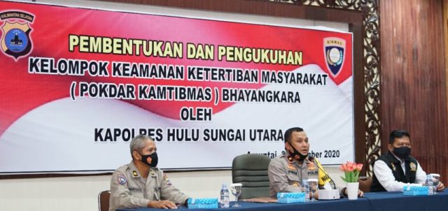Polda Kalsel, Polres Hulu Sungai Utara (HSU) – Kesadaran masyarakat dalam membantu menjaga keamanan dan ketertiban sangat penting sekali, jumlah anggota Polri yang tidak sebanding dengan jumlah penduduk Indonesia menjadi alasan utama untuk membentuk sebuah kelompok masyarakat yang memiliki kesadaran lebih tinggi dari masyarakat lainnya terkait ketertiban dan keamanan untuk membantu Kepolisian di Indonesia, maka dari itu dibentuklah Pokdarkamtibmas Bhayangkara khususnya di daerah hukum Polres HSU, Kamis (03/12/2020).