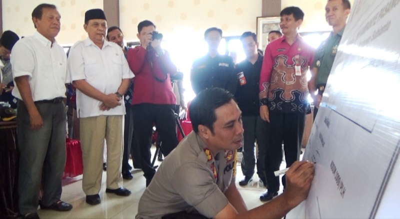 Turut hadir Sekda Tala Syahrian Nurdin, ketua parpol, KPU Tala, Panwaslu Tala, Ketua Tim Sukses Jokowi-Amin Adriansyah (mantan Bupati Tala) dan Ketua Tim sukses Prabowo-Sandiago Uno Atmari (mantan Wakil Bupati Tala). Untuk bersama-sama menandatangani ikrar damai di atas papan baliho berukuran 1 x 2 meter bergambar masing-masing lambang parpol.