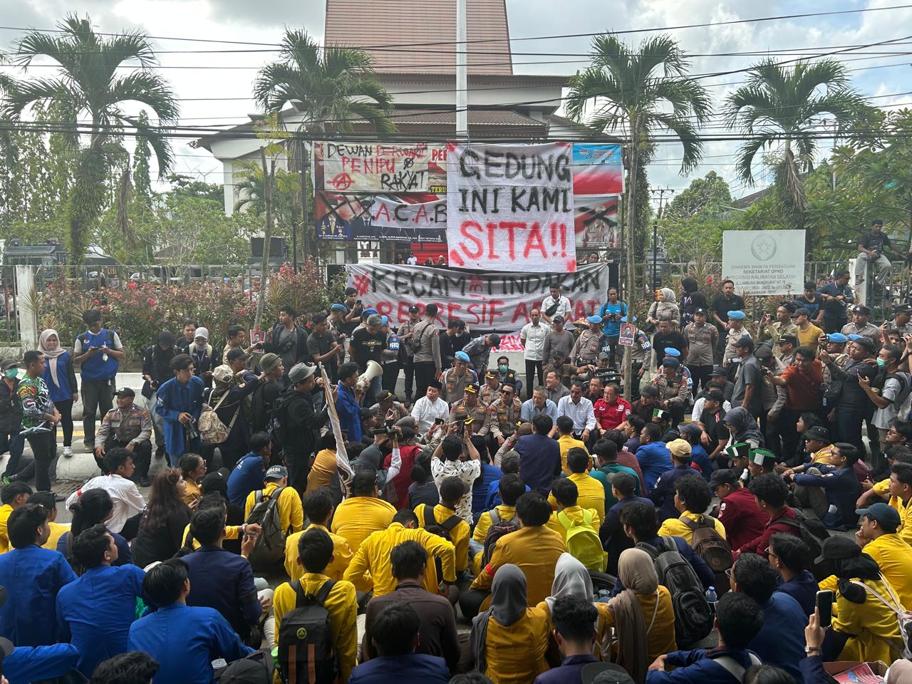 Aksi sejumlah BEM seluruh mahasiswa di Kalsel saat demo di halaman Kantor DPRD Kalsel, Rabu (26/11/2025). (foto: istimewa)
