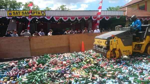 Banjarmasin, BARITO – Polresta Banjarmasin musnahkan barang bukti ribuan botol minuman beralkohol, Kamis (1/9/2022) siang. Dengan menggunakan alat berat stoom menggilas botol miras yang dihadiri Forkopimda setempat.