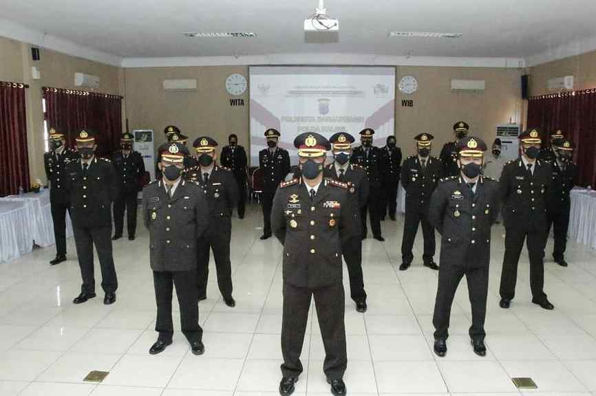 Dengan menjaga jarak satu dengan lainnya, kapolresta dan perwira lainnya berdiri dengan jarak dua meter alias tanpa adanya kursi. Dengan terhubung layar monitor pihak polresta dengan seirus menyimak dari awal hingga akhir upacara tersebut.