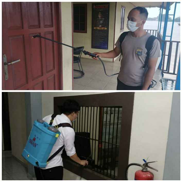 Usai olahraga bersama, jajaran Polresta Banjarmasin dan polsek jajaran secara serentak lakukan penyemprotan Disinfektan. Penyemprotan dilakukan hampir di semua ruangan