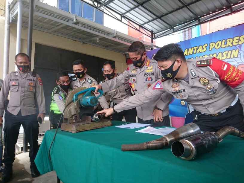 Satu persatu knalpot sepeda motor yang terjaring Operasi Patuh Intan 2020 itu dilepas dan dipotong. Tujuannya sebagai efek jera kepada pebalap liar yang terjaring dan menghindari penyimpangan terhadap barang bukti tersebut.