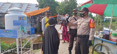 Polsek Anjir muara, dalam kegiatan Pam Pasar Jum’at dan kegiatan pendisiplinan masyarakat untuk melaksanakan protokol kesehatan di daerah hukum Kecamatan Anjir Muara Kabupaten Batola Kalsel, Jum’at (18/9/2020).