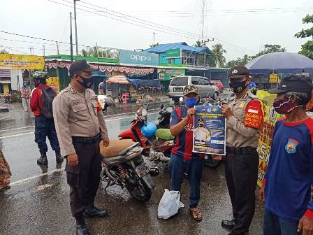 Polres Batola Personel Polsek Anjir muara terapkan Perbub Batola nomor 54 tahun 2020 Bagi warga yang belum memakan masker akan ada sanksi kepada warga, tapi tetap di bagi masker Minggu, (6/9/2020).