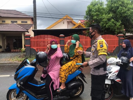 Tidak hanya membagi masker, Bhabinkamtibmas ini juga memberikan imbuan kepada masyarakat untuk mengikuti protokol kesehatan demi pencegahan virus Covid-19.