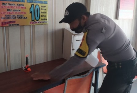 Ruang pelayanan publik adalah area yang rawan terjadi penyebaran covid-19, kesiapsiagaan anggota dalam mengantisipasi penyebaran covid-19 selalu dilakukan penyemprotan secara rutin baik pada gagang pintu, meja, kursi, yang sering dipegang oleh masyarakat saat datang ke Polsek Kintap.