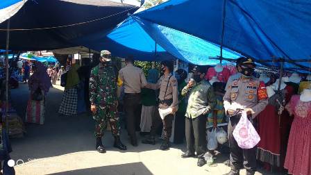 Polres Batola, Anjir muara, lanjutan pembagian masker serentak kamis yang dilaksanakan se Indonesia, Kamis, (10/9/2020) kemarin, lanjutannya di Pasar Kemis Km.17 Desa Mekarsari Kec Mekarsari Kab Batola pembagian masker dan kampanye jaga jarak dan hindari kerumunan dalam rangka Ops yustisi penggunaan masker serta Pikada 2020 yang Aman, Damai dan Sehat yang dilaksanakan oleh Porkopimcam Mekarsari Kab Batola, dan itu salah satu program prioritas Kapolda Kalsel Irjen Pol Dr Nico Afinta, S.I.K., S.H.,M.H, Jum’at, (11/9/2020).