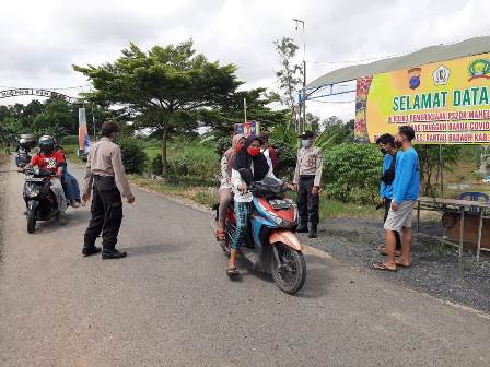 Batola – Posko Penegakan Disiplin Protokol Kesehatan Kecamatan Rantau Badauh di Pos Terpadu Kampung Tangguh Mahelat Lebo Desa Sei Gampa Kec Rantau Badauh Kab Batola, melaksanakan kegiatan penegakan disiplin protokol kesehatan terhadap masyarakat yang akan memasuki di wilayah itu, Jum’at (24/07/20 ).