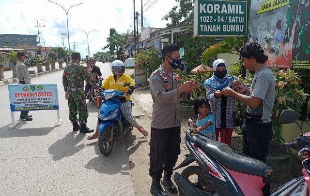 Polsek Satui Bagikan Masker Ke Pengguna Jalan