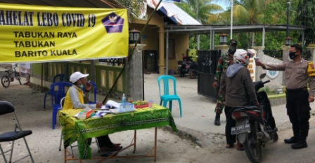 Posko Penegakan Disiplin Protokol Kesehatan Kecamatan Tabukan di Pos Terpadu Kampung Tangguh Mahelat Lebo Desa Tabukan Raya melaksanakan kegiatan penegakan disiplin protokol kesehatan terhadap masyarakat yang akan memasuki wilayah Kecamatan Tabukan, Senin (13/07/20 ).