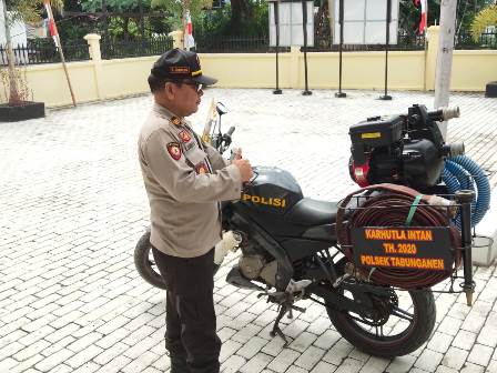 Polres Batola Kapolsek Tabunganen AKP Lukman Simbolon, SH bersama Anggotanya uji-coba mesin yang sudah di modifikasi sepeda motor Roda 2 Bhabinkamtibmas dalam rangka kesiapan Karhutla di daerah hukum Tabunganen Kabupaten Batola, Selasa (4/8/2020).