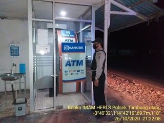 Antisipasi kejahatan obyek vital seperti di Anjungan Tunai Mandiri (ATM), anggota Polsek Tambang Ulang Polres Tanah Laut rutin melaksankan giat patroli baik siang dan malam hari di sekitar kawasan ATM milik Bank BRI unit Bati – Bati yang berada di Jl. A. Yani Desa Pulausari wilkum Polsek Tambang Ulang Polres Tanah laut Polda Kalimantan selatan, Senin (26/10/2020).
