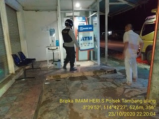 Antisipasi Kejahatan Obyek Vital seperti di Anjungan Tunai Mandiri (ATM), Anggota Polsek Tambang Ulang Polres Tanah Laut rutin melaksankan giat patroli baik siang dan malam hari di sekitar kawasan ATM milik Bank BRI unit Bati – Bati yang berada di Jl. A. Yani Ds. Pulausari wilkum Polsek tambang Ulang Polres Tanah laut Polda Kalimantan selatan. Jumat (23/10/2020)