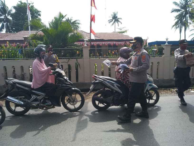 Bertempat duJalan Tembus Mantuil Banjarmasin, beberapa petugas berdiri di tepi jalan, sambil menyetop pengendara yang melintas guna membagikan masker. Pembagian masker itu tak hanya ke pengendara, tetapi juga yang naik sepeda dan pejalan kaki yang melintas di depan polsek tersebut.