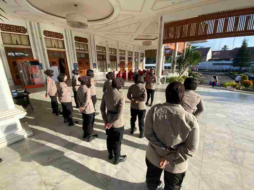 Bukan polisi laki-laki (Polki) yang diterjunkan, melainkan personel polisi wanita (Polwan) yang dikerahkan untuk pengamanan pelaksanaan program vaksinasi Covid-19.