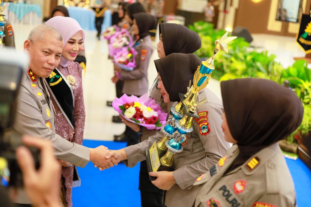 Penghargaan diserahkan oleh Kapolda Kalsel Irjen Pol Rosyanto Yudha Hermawan bersama Ketua Bhayangkari Daerah Kalimantan Selatan sekaligus Ibu Asuh Polwan Polda Kalsel, Yennie Rosyanto Yudha, pada acara syukuran Hari Jadi ke-77 Polwan RI di Auditorium Bhara Daksa Polda Kalsel, Selasa (23/9/2025).