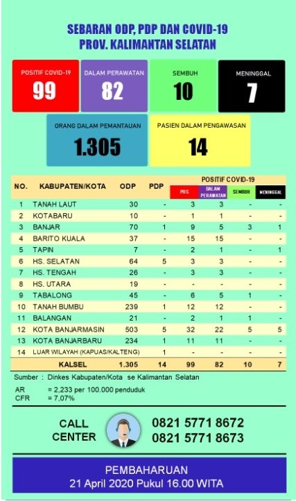 Juru Bicara Gugus Tugas Percepatan Penanganan Covid-19 Kalsel, Muhammad Muslim mengatakan, bertambahnya 4 kasus positif, dari semula 95 menjadi 99, karena seorang pasien dalam pengawasan (PDP) yang terkonfirmasi positif, yakni yang dirawat di RSUD Ulin Banjarmasin.