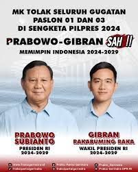 Dengan putusan MK ini, maka artinya Prabowo-Gibran sah jadi Presiden dan Wakil Presiden RI 2024-2029. “Hari ini kita sudah selesai mengikuti persidangan dan berjalan terus sampai sekarang semua sehat-sehat dan puji Tuhan karena kebetulan hasilnya juga menang kepada Paslon 02 ditetapkannya Prabowo-Gibran sebagai Presiden dan Wakil Presiden dan terhitung sejak putusan itu resmilah dan sahlah Prabowo-Gibran sebagai Presiden dan Wakil Presiden Republik Indonesia untuk 5 tahun ke depan,” tuturnya di Gedung MK, Jakarta, Senin (22/4/2024).