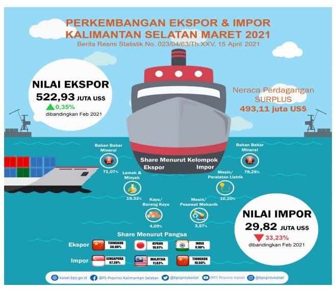 Berdasarkan data resmi Badan Pusat Statistik (BPS) Provinsi Kalimantan Selatan yang dirilis 15 April 2021, neraca perdagangan ekspor-impor Kalsel pada bulan Maret 2021 surplus US$493,11 juta atau sekitar Rp 7,2 triliun.