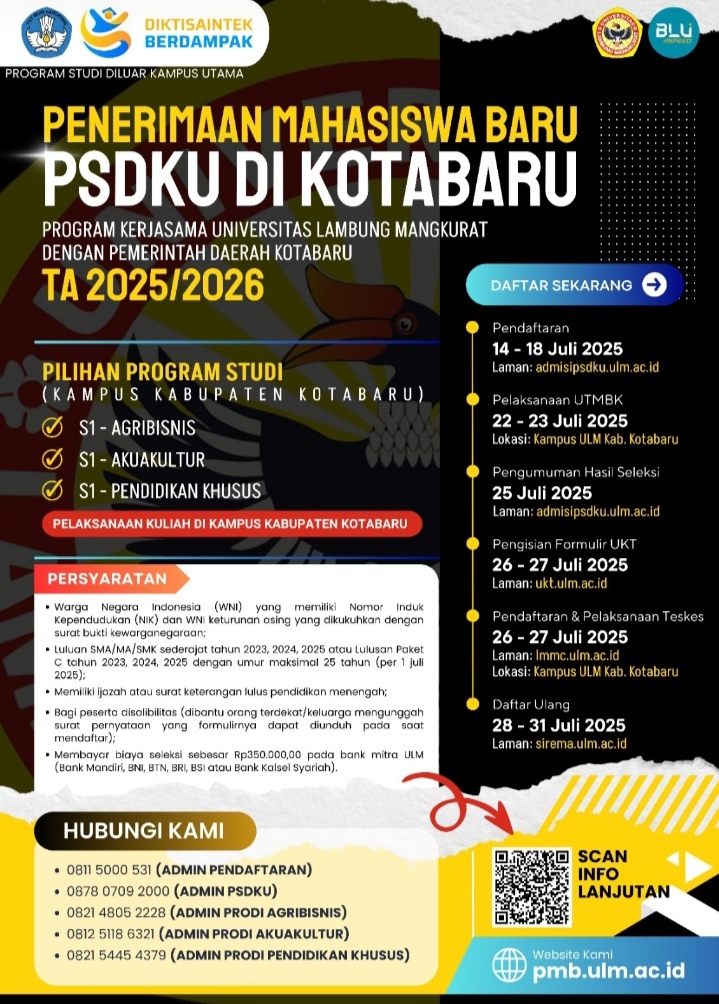 Penerimaan mahasiswa baru PSDKU ULM Kotabaru telah dibuka dengan 3 program studi yaitu, Prodi Sarjana (S1) Akuakultur, Prodi Sarjana (S1) Agribisnis, dan Prodi Sarjana (S1) Pendidikan Khusus.