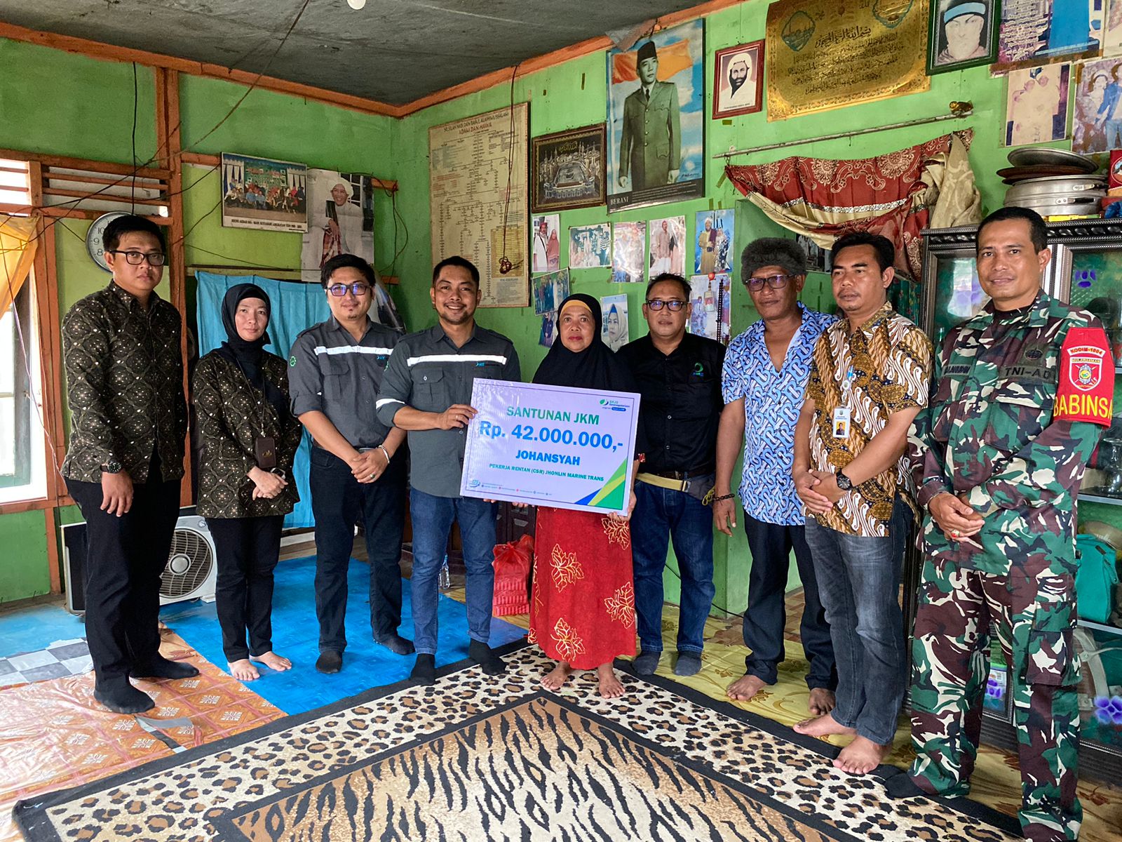 SANTUN JKM-BPJS Ketenagakerjaan Batulicin saat menyerahkan santunan JKM di kediaman almarhum Zainal di Desa Bersujud bersama Direktur PT JML Efgar Welmar Santos dan Kepala Desa Bersujud Jumriadi, Kamis (2/11/2023).(foto : ist)