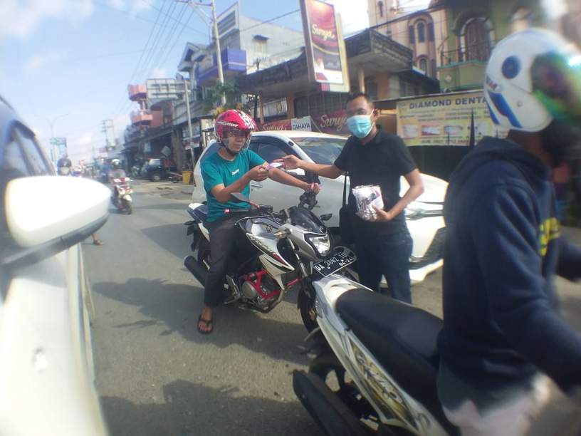 Aksi bagi-bagi masker dilaksanakan anggota PWI yang tergabung dari beberapa wartawan media cetak dan online yang bertugas di Bumi Bersujud yang dipusatkan diperempatan Simpang Empat lampu merah, Jum’at (23/10) disambut baik oleh sejumlah pengendara.