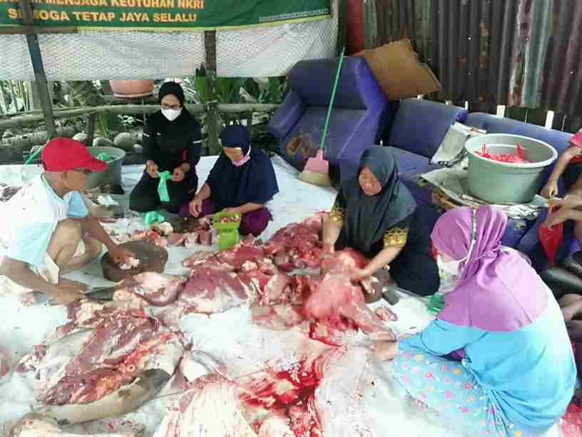 Penyembelihan kedua hewan kurban itu dilakukan oleh Anggota Polri Bripka H. Jafar personel Dit Polairud Polda Kalsel dan menerapkan protokol kesehatan dalam pendistribusian daging kurban.