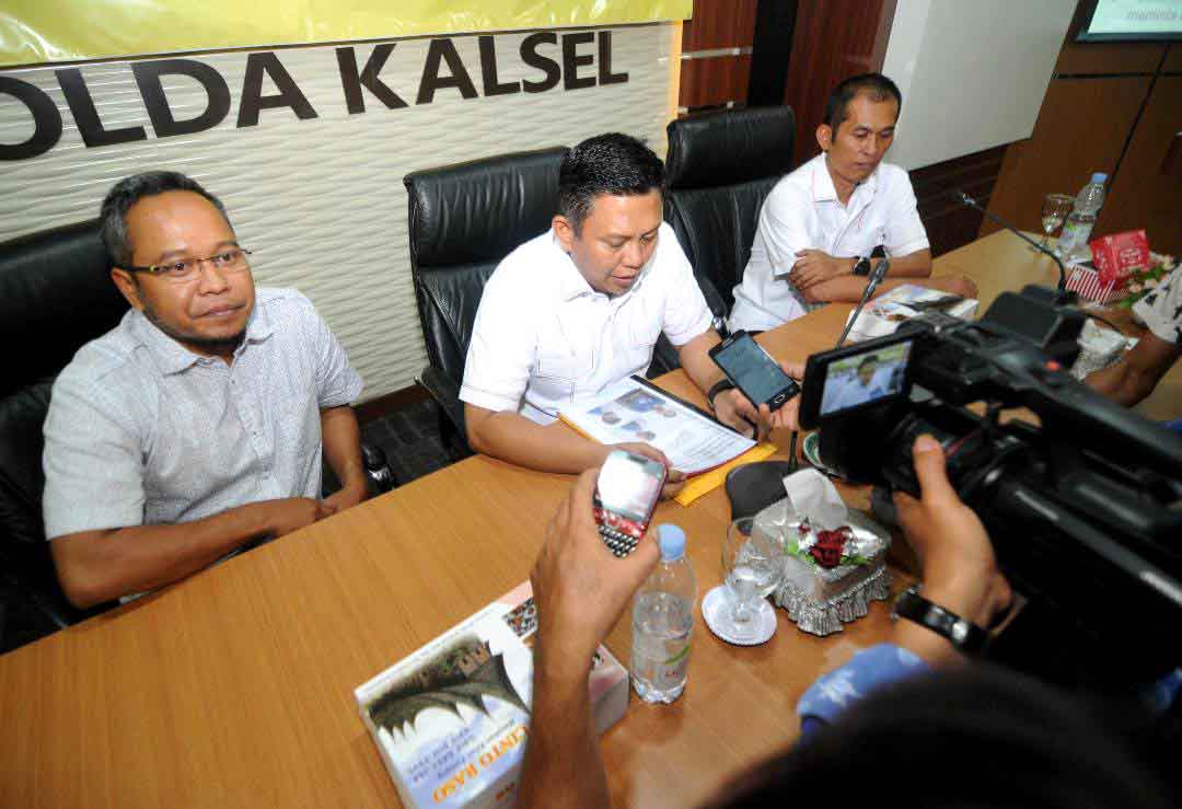 Direktur Ditreskrimsus Polda Kalsel Kombes (Pol) Rizal Irawan (tengah) Wakabid Pendidikan PWI Kalsel Toto Fachrudin (kiri) Wadir Direstkrimsus (kanan) saat memberikan keterangan pers usai pencerahan hukum tentang UU Pers kepada penyidik Tindak Krimsus se Kalsel di Aula Rupatama Mapolda setempat, Selasa kemarin. (foto:iman satria)