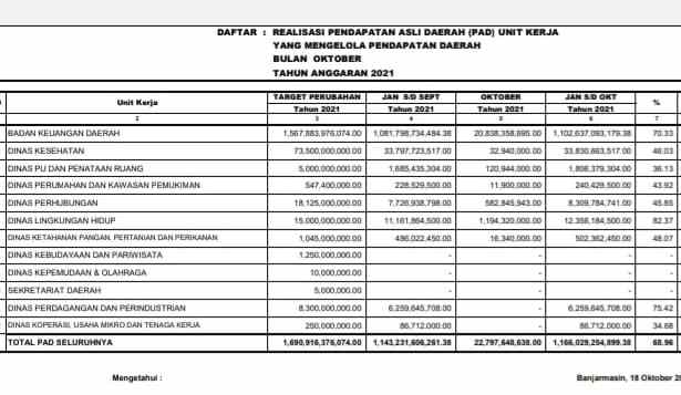 Menurut Kepala Bakeuda Kota Banjarmasin Subhan Nor Yaumil, pendapatan asli daerah yang dikelola 12 unit kerja di Pemko Banjarmasin hingga data Oktober ini hanya beberapa SKPD yang menunjukan pencapaia memusaskan. Contohnya Dinas Lingkungan Hidup (DLH).