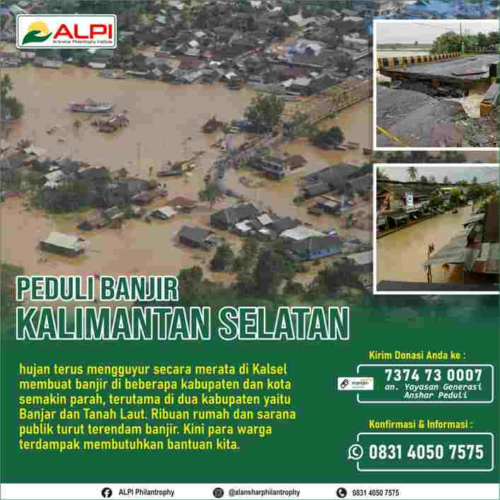 “Mari segera kita tunjukkan solidaritas dan kepedulian kita kepada sesama yang membutuhkan bantuan kita, dengan menyalurkan bantuan kemanusiaan untuk saudara kita yang menjadi korban banjir di Provinai Kalsel, dan Donasi bisa disalurkan melalui Al Anshar Philantrophy Institute (ALPI) Barsel melalui rekening di bawah ini,” ucap Fathurrahman.