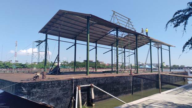 Banjarmasin, BARITO – Proses pengerjaan proyek restoran terapung pertama milik Pemko Banjarmasin, hampir selesai. Bangunan yang berlokasi di Sungai Martapura depan Balai Kota Banjarmasin itu sudah tahap penyelesaian atap.