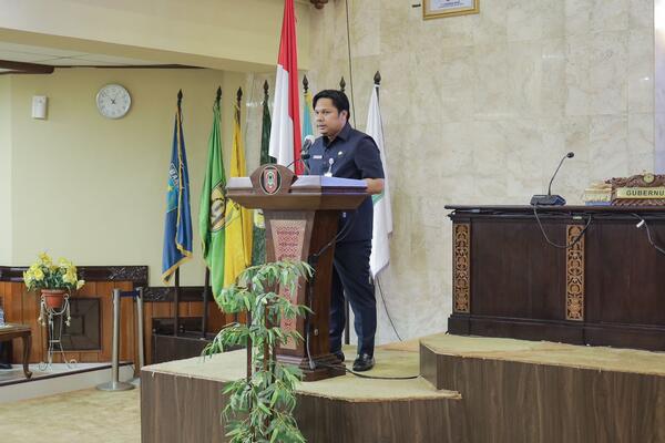 Roy Rizali Anwar menyampaikan penjelasan gubernur atas pengajuan Rancangan Peraturan Daerah (Raperda) tentang Rencana Tata Ruang Wilayah Provinsi Kalsel Tahun 2023-2043 yang naskahnya telah kami sampaikan kepada DPRD Provinsi Kalsel melalui Surat Nomor 188.341/00175/KUM pada 30 Januari 2023.