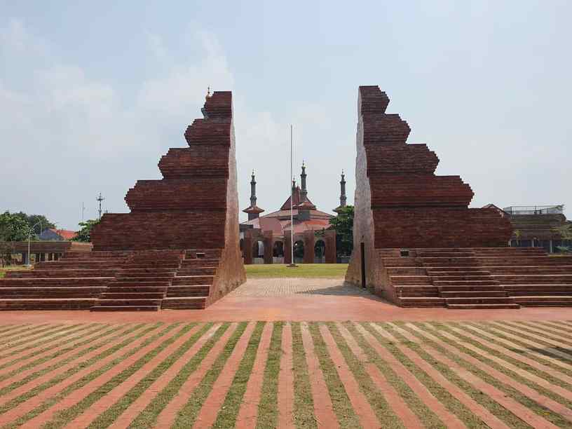 Di pintu utama alun-alun, dibangun dua gapura besar khas bangunan keraton setinggi 15 meter. Karakteristik bangunan keraton berwarna merah bata nampak hadir di berbagai sudut alun-alun.