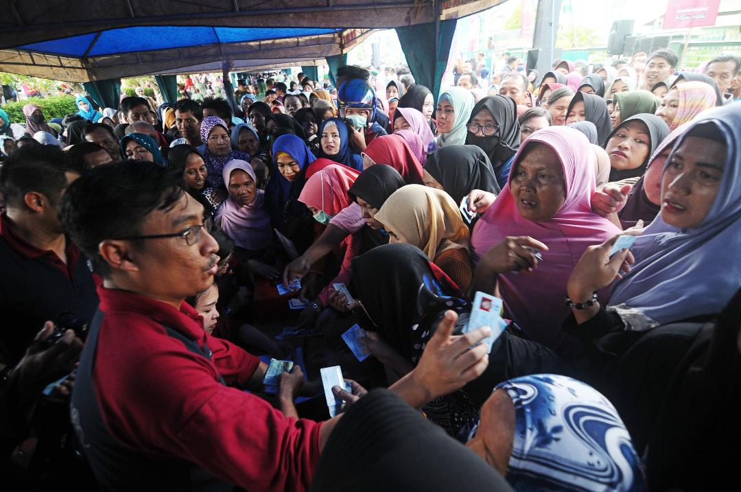Banjarmasin, BARITO – Ribuan warga Kota Banjarmasin dan sekitarnya memenuhi ruas Jalan Jenderal Sudirman depan Markas Korem 101/Antasari, Banjarmasin, Rabu (10/4). Mereka ramai-ramai menyerbu stan bazaar sembako murah yang disediakan Korem 101/Antasari, Persit Kartika Chandra Kirana serta beberapa BUMN yang turut berpartisipasi.