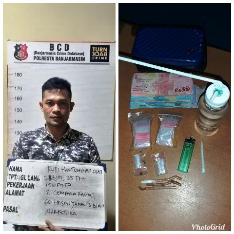 Seorang pemuda bernama Rudi Hartono alias Odet (35) diciduk di rumahnya, Jumat (19/6/ 2019¬) malam sekitar pukul 21.00 Wita. Dari warga Jalan Cempaka Raya Gang Hasan Yamani 3 RT 25 Kelurahan Basirih Kecamatan Banjarmasin Barat itu ditemukan Barang Bukti (Barbuk) tiga paket Sabu berat bersih 0,16 Gram.
