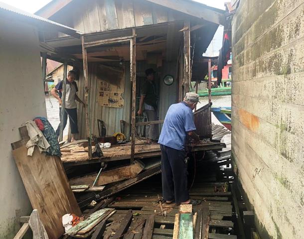 Banjarmasin, BARITO – Salah satu rumah warga Gang Soto Jalan Kuin Selatan Kelurahan Kuin Cerucuk RT 08 RW 01 mengalami nyaris roboh di bantaran sungai setempat, Rabu (2/1) siang sekitar pukul 14.00 Wita. Rumah milik M Saufi (48) itu kondisinya bagian belakang rumah mau runtuh.