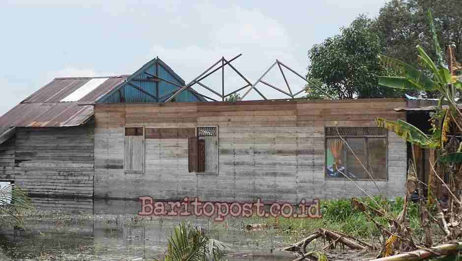 Pelaihari,BARITO – Raut wajah M Yani warga di Desa Handil Birayang Bawah Rt 6 di Kecamatan Bumi Makmur terlihat pasrah manakala bencana banjir yang tengah ia alami bersama warga lainnya dan belum surut, kini bencana datang kembali kepadanya lantaran amukan tiupan angin puting beliung memporak-porandakan rumahnya.