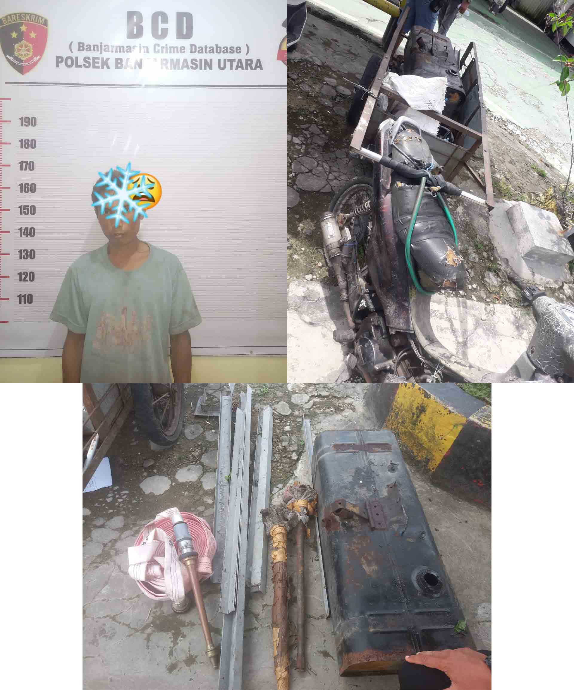 Adapun barang.yang dicuri pelaku warga Jalan Sungai Pahalau Kelurahan Pekauman Banjarmasim Selatan itu berupa Barang bukti sebanyak 11 batang besi, satu tangki minyak truk, satu selang pemadam dan as pendek truk