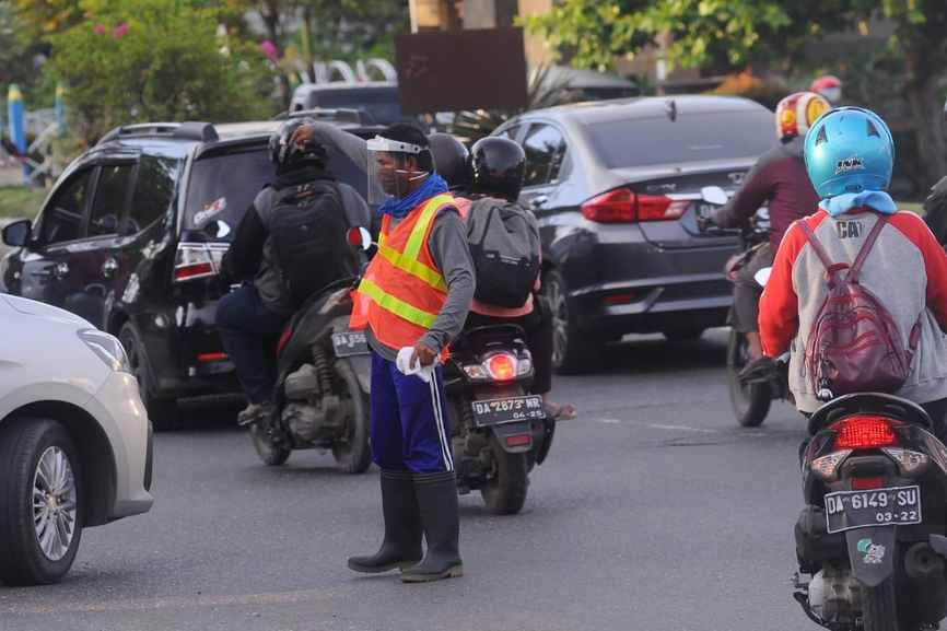Bani (53 tahun) setiap hari menggunakan masker dan penutup wajah (face shield) saat beraktifitas mengatur jalan, banyak warga yang terbantu dengan pekerjaannya ini, tidak jarang iya mendapatkan upah sukarela dari pengguna jalan yang melintas